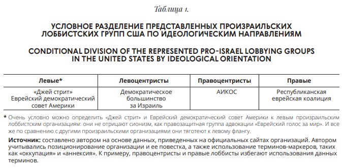 Характеризуя произраильское лобби на современном этапе его развития, профессор Д. Уаксман условно разделил его на левых, правых и центристов. «Джей стрит», по его мнению, представляет левых произраильских лоббистов, к центристам он причисляет АИКОС, хотя и указывает, что он идеологически сдвинулся вправо за последнее время, а к правым – Сионистскую организацию Америки и Республиканскую еврейскую коалицию. Как представляется, в 2020-е гг. сообщество произраильских организаций стало еще более фрагментированным (см. Таблицу 1).