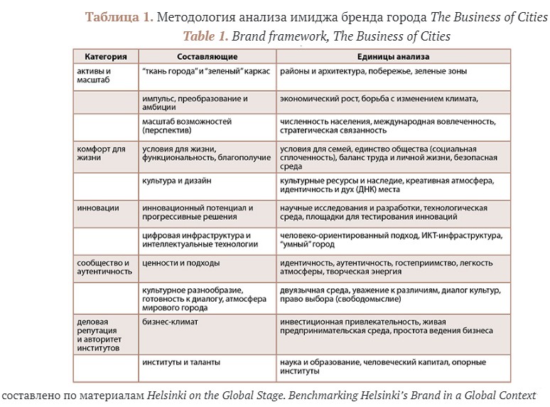 Главным управленческим инструментом здесь выступает маркетинг города – “комплекс действий городского сообщества, направленных на выявление и продвижение своих интересов для выполнения конкретных задач социально-экономического развития города. В широком смысле это продвижение интересов города… способ решения задач развития города путем расширения его влияния и создания положительной репутации”. Инструментарий маркетинга городов весьма обширен, однако в целом можно выделить два главных смысловых блока – материальный и нематериальный. Первый связан с продвижением зримых измерений прогресса – достижений города в транспорте, строительстве, развитии социальной инфраструктуры, общественных пространств и сервисов и др., которые становятся символами устремленности города в лучшее будущее и даже “объектами восхищения”. Второй блок охватывает вопросы позиционирования города на базе таких составляющих, как наука, культура, социальная атмосфера, среда для бизнеса и инноваций. Накопленный городом капитал в этих двух сферах усиливает его позиции как пространства развития, притягательного для жизни и творчества. Существует множество метрик оценки международного бренда города как репрезентации такого капитала в массовом сознании. Для настоящей работы любопытной представляется методология лондонской компании The Business of Cities: ее составляющие дают представление о том, на какие ресурсы может опираться современный мегаполис (табл. 1).
