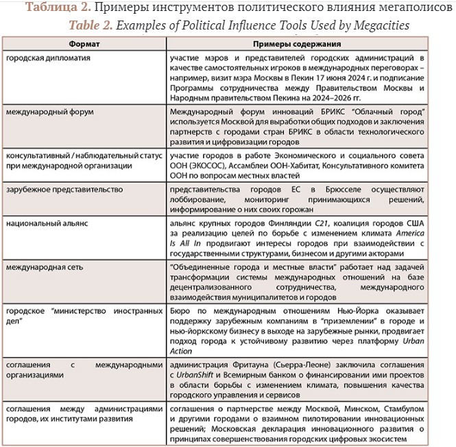 Включенность городов в те или иные взаимосвязи постулируется как главный фактор их политического влияния: так, Кент Колдер относит к главным характеристикам “глобальных политических городов” их участие в “накладывающихся друг на друга страновых и международных сетях”, при котором политические взаимодействия на этих двух уровнях часто “пересекаются или тесно смешаны”. Можно встретить и тезис о том, что динамика международного политического статуса и влияния мегаполиса напрямую зависят от его положения в “международном пространстве потоков”, таких как “сервисные, политические, информационные, финансовые, культурно-гуманитарные, научно-образовательные, интеллектуальные, товарные, ресурсные”, способности “привлекать и концентрировать значительные ресурсы сети или быть исключенным в качестве узла сети”. Распространенным методом оценки включенности города в международные взаимосвязи выступает расчет количества представительств транснациональных корпораций и международных организаций, размещенных в мегаполисе как фактора, влияющего на его политический вес: «В своих амбициях на вхождение в клуб глобальной элиты мегаполисы охотно идут на союз с МНПО, доказавшими свою эффективность как инструмента “мягкой силы”». Опираясь на вышесказанное, можно выделить некоторые наиболее значимые, по мнению автора, форматы присутствия мегаполисов в мировом политическом пространстве (табл. 2).