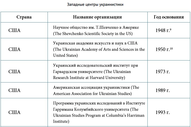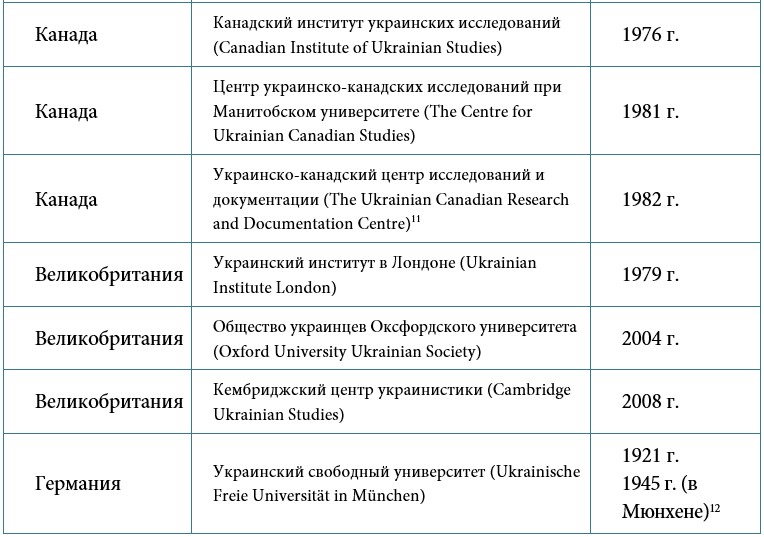 В настоящий момент ключевые западные центры украиноведения расположены в США, Канаде, Великобритании, Германии и других европейских государствах (Таблица).
