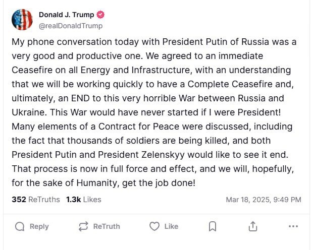 "Мой сегодняшний телефонный разговор с президентом России Путиным был очень хорошим и продуктивным. Мы договорились о немедленном прекращении огня по всей энергетике и инфраструктуре, при том понимании, что мы будем быстро работать над тем, чтобы иметь полное прекращение огня и, в конечном итоге, КОНЕЦ этой ужасной войны между Россией и Украиной. Эта война никогда бы не началась, если бы я был президентом! Были обсуждены многие элементы Договора о мире, в том числе тот факт, что погибают тысячи солдат, и президент Путин, и президент Зеленский хотели бы, чтобы это закончилось. Этот процесс теперь в полной силе и действии, и мы, надеюсь, ради человечества, выполним свою работу!", - написал он в своей соцсети Truth Social.