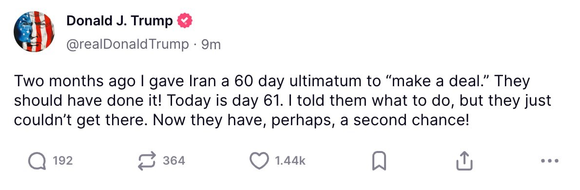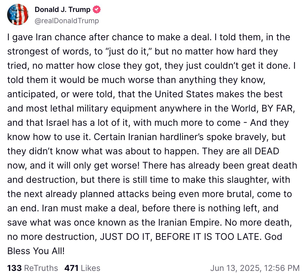 "Миротворец" Трамп всецело одобрил кровавое нападение. Одобрил заранее (в четверг не раз созванивался с "Биби") и по итогам. В эфире Fox News он признался, что знал о планах Израиля. "Я думаю, что это было превосходно. <...> Их ударили жёстко. Очень жёстко. Настолько жёстко, насколько вообще можно ударить. <...> И это ещё не всё. Впереди ещё много всего", - сказал он в интервью ABC News. "Два месяца назад я поставил Ирану ультиматум сроком на 60 дней, чтобы «заключить сделку». Им следовало это сделать! Сегодня — 61-й день. Я сказал им, что нужно делать, но они так и не смогли. Теперь у них, возможно, появился второй шанс!", - написал американский президент в собственной соцсети Truth Social. Другой пост Трампа гласит: "Я давал Ирану шанс за шансом заключить сделку. Я говорил им, в самых сильных выражениях, «просто сделайте это», но как бы они ни старались, как бы близко они ни были, они просто не могли этого сделать. Я предупредил их, что последствия будут гораздо хуже всего, что они знают, чего ожидают или о чём им говорили. Что Соединённые Штаты производят лучшее и самое смертоносное военное оборудование в мире — с огромным отрывом. А Израиль обладает значительной его частью — и получит ещё больше. И, что важно, они умеют этим пользоваться. Некоторые иранские сторонники жёсткой линии делали смелые заявления, но они не представляли, что на них надвигается. Теперь все они МЕРТВЫ. И дальше будет только хуже. Уже сейчас это обернулось большими жертвами и разрушениями. Но ещё не поздно остановить эту бойню. Следующие запланированные удары будут ещё более жестокими. Иран должен заключить соглашение — прежде чем от него ничего не останется. Прежде чем исчезнет то, что когда-то называлось Иранской Империей. Больше никаких смертей. Больше никаких разрушений. ПРОСТО СДЕЛАЙТЕ ЭТО, ПОКА НЕ СТАЛО СЛИШКОМ ПОЗДНО. Да благословит вас Бог!"