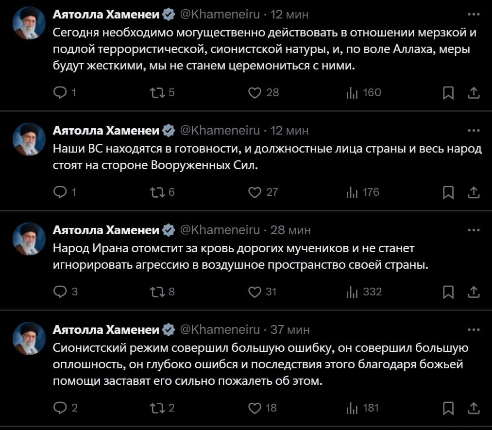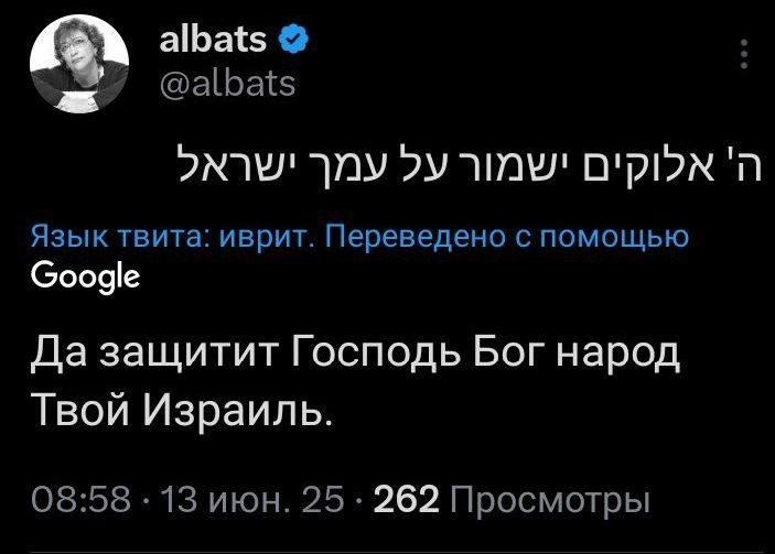 Военкор Тимофей Ермаков: "Кстати, по поводу наших любимых переговоров и участия в них американцев. Израиль нанёс удар, который очевидно готовили долго и тщательно, прямо посреди переговорного процесса. Ударил прежде всего по ядерным объектам. Ничего не напоминает? Вопрос — применять или не применять силу — у США и их сионистской шавки даже не стоит. Они никогда и не рассматривали никакого другого варианта, за исключением полной капитуляции Ирана. И если кто-то в руководстве считает, что отношение к нам какое-то принципиально другое, то это политическое слабоумие. Недавно видел радостный твит главы РФПИ Кирилла Дмитриева о том что число россиян, называющих США враждебными, снизилось с 75% до 40%, а поддержка нормализации отношений с Западом возросла с 52% до 80%. Очень надеюсь, что эти цифры не отражают реальность. В противном случае нас ждут уничтожающие психику людей «сюрпризы». <...> У кого-то ещё есть сомнения, что именно Моссад разрабатывал и планировал атаки на наши аэродромы?" Политолог Марат Баширов: "Самое время вспомнить, что в 2021 году было заключено Стратегическое партнёрство между Китаем и Ираном, оформленное в виде всеобъемлющего соглашения, которое включает сотрудничество в различных областях, таких как экономика, политика, культура, военная сфера и оборонная промышленность. В рамках этого партнёрства Китай планирует инвестировать значительные средства в экономику Ирана в обмен на стабильные поставки нефти по низкой цене. А 17 января 2025 года в Москве был подписан Договор о всеобъемлющем стратегическом партнёрстве между Россией и Ираном. Теперь о нашем интересе. Мы против поражения Ирана категорически. Но вот вопрос: а насколько категорически мы против поражения Израиля?" Журналист-международник Аббас Джума: "Это было прогнозируемо. Для Израиля всё, что происходит и происходило вокруг Ирана — было травмирующим. <...> Израилю было достаточно того факта, что Иран существует, что Иран здравствует, благоденствует, развивает свой ВПК, развивает экономику, связи с региональными державами, заключает стратегические договоры с Китаем, с Россией. Вот этого всего Израиль не мог допустить. <...> Израиль много лет планировал свою операцию, — Ynet. «Моссад» завёз в Иран ударные системы вблизи иранских ЗРК и создал базу дронов «в самом сердце Ирана». Я больше года провожу параллели между Израилем и Украиной. <...> Гибель начальника Генштаба Вооружённых сил Ирана генерала Багери и командующего КСИР генерала Салами — это серьёзно. Но весь год Израиль убивает ключевых лиц Оси сопротивления. Всё стоит и продолжает работать, так как незаменимых нет. Это касается и Верховного лидера. Тем более, в истории Ирана такое уже происходило. В 1981 году. В самом начале ирано-иракской, когда Иран был гораздо слабее. <...> Представитель израильской армии: «Только Иран несёт ответственность за нынешнюю напряжённость на Ближнем Востоке». Понимаете, да? Израиль не начал вчера. Это нам показалось".