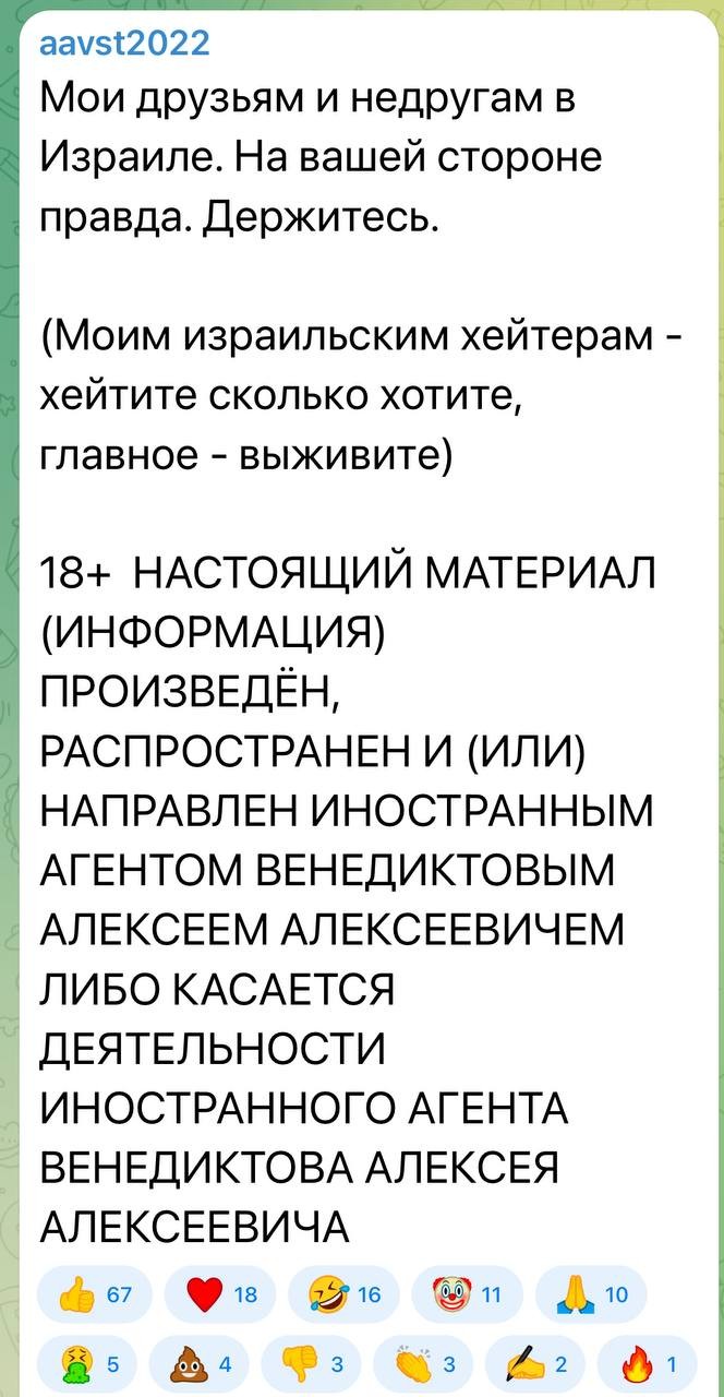 Русская певица Виктория Цыганова: "Израиль бомбит мирные города Ирана. С нетерпением ждём заявлений от иноагентов, «нетвойнистов», релокантов и «испуганных патриотов». Почему Ваня Ургант до сих пор не запостил чёрный квадрат с подписью «страх и боль. Нет войне»? Куда же подевались заявления иноагента Макаревича после ударов по мирным городам Ирана, что от евреев воняет и жить с ними в одной стране он не может? Почему гражданин Израиля иноагент Егор Бортник, спонсирующий ВСУ, до сих пор не назначил дату благотворительного концерта Би-2 в поддержку иранской армии? Почему иноагент Максим Галкин хранит молчание и не задаётся вопросом, зачем фашистское правительство Израиля бомбит мирных людей сразу после светлого еврейского праздника Шавуота? И когда же уже наконец иноагент Слепаков с израильтянкой Фуней Пугачёвой запишут песни, высмеивающие агрессию Израиля? Удивительные двойные стандарты со стороны релокантов, убегантов, возвращенцев и извращенцев. Когда дело касается России — они пацифисты, ну а Израиль — это другое. Поразительная ненависть к России, сочетающаяся с любовью к деньгам и к фашиствующему сионистскому правительству Израиля. Уехавшим лицемерам и лицедеям навсегда въезд в Россию закрыть и признать врагами народа, а тех, кто до сих пор в России сидит — «гнать *** тряпками» прямо до границы Израиля, который они так любят". ТГ-канал "Отряд Ковпака": "Все российские антивоенные активисты, учителя жить не по лжи, борцы с «великорусским шовинизмом», совестливые покаянцы за «преступления» русского народа почему-то сегодня на иврите молятся, чтобы Израиль безнаказанно убил как можно больше людей в Иране".