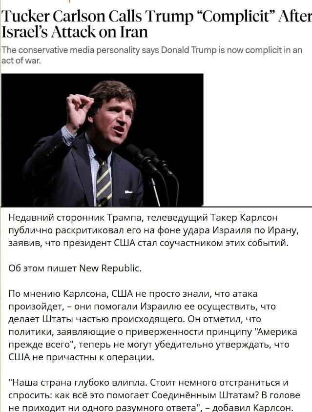 Между тем самый популярный американский телеведущий Такер Карлсон впервые резко раскритиковал Трампа, назвав его соучастником нападения Израиля на Иран. Карлсон, давний противник интервенционистов-неоконов, требовавших от Донни занять более жёсткую позицию в отношении Ирана, обвинил Трампа в "причастности к акту войны".