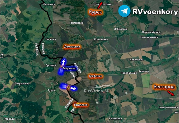 "Русская Весна": "Воспользовавшись снегопадом, ВСУ с утра стянули силы для прорыва госграницы в районе н.п. Демидовка — Графовка — Прилесье Краснояружского района Белгородской области, вблизи с границей с Курской областью. После отражения ряда атак и уничтожения танков и бронемашин ВСУ, спешившаяся украинская пехота рассеялась в посадках у границы между селом Турья (Сумская область) и посёлком Прилесье, где продолжились бои. Затем инженерные машины разграждения снова разминировали небольшой пограничный участок со стороны Марьино (Сумская область) и стали растаскивать «зубы дракона» между Демидовкой и Графовкой. Бои у госграницы не прекращаются. Продолжается прочёсывание лесополос, где высадилась пехота ВСУ, огнём артиллерии и дронами. <…> Сначала противник из Сумской области пустил 2 ИМР для проделывания прохода в минных полях и линии «зубов дракона» и смог это частично сделать. После уничтожения нашими войсками машин разграждения ВСУ направили танковую группу в направлении приграничной Демидовки. Идёт ожесточённый бой, наши отражают атаку. <…> Едущие из Сумской области танки только что попытались прорваться по проделанному ИМР проходу в минных полях и линии «зубов дракона», но их встречает огнём армия России. Часть бронетехники подбита у границы. <…> Российские войска за день уничтожили не менее 4 ИМР, до 6 танков, несколько БМП и ББМ. Вечерняя атака врага на Демидовку в Белгородской области захлебнулась, танки были подбиты до пересечения границы".
