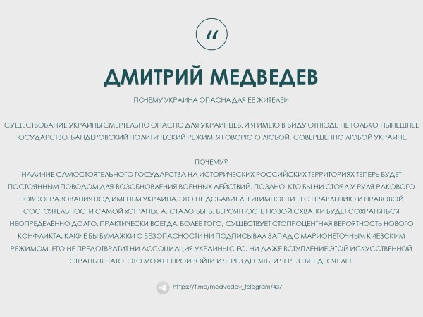 "Существование Украины смертельно опасно для украинцев. И я имею в виду отнюдь не только нынешнее государство, бандеровский политический режим. Я говорю о любой, совершенно любой Украине.