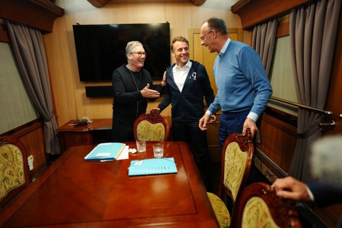 Либеральный французский президент Эмманюэль Макрон, леволиберальный британский премьер-министр Кир Стармер и праволиберальный германский канцлер Фридрих Мерц находились в купе поезда, направляясь в Киев. Предводители "коалиции желающих" готовились к встрече с наркофюрером Владимиром Зеленским и другими вожаками киевской банды дегенератов. Столь активно готовились, что не услышали приближающихся репортёров. Оператор AP застал великих деятелей современности врасплох.