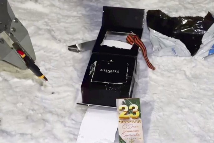 Причём к коробкам сверху были приклеены георгиевские ленточки, а внутри по соседству с бомбами находились открытки с поздравлениями в честь Дня защитника Отечества.