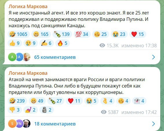 "Мне кажется, что это клевета какая-то, потому что, ну, во-первых, я не иноагент, во-вторых, у меня никаких не было контактов. Ну, иногда как-то могут ошибиться", - заявил гендиректор ООО "Институт политических исследований" каналу Ксении Собчак. "Это просто коррупционное деяние какое-то. Кто-то под влиянием каких-то коррупционных структур. Известно, что есть люди и структуры, которые меня не любят. <...> Те, кто меня атакует, — они либо будут проявлены как предатели, либо будут уволены за коррупцию. Потому что пока все, кто против меня каким-то образом воевал, все прошли этот путь", - заявил Марков* RTVI. "Я не иностранный агент. И все это хорошо знают. Я все 25 лет поддерживал и поддерживаю политику Владимира Путина. И нахожусь под санкциями Канады. Атакой на меня занимаются враги России и враги политики Владимира Путина. Они либо в будущем покажут себя как предатели или будут уволены как коррупционеры. На меня сейчас обрушилась волна поддержки. Мне звонят и пишут сотни честных людей, настоящих патриотов России, желают удачи и выражают уверенность, что всё разрешится хорошо. Спасибо вам всем большое. А я был и остаюсь и патриотом России и сторонником Владимира Путина. Кажется, это единственный случай, когда иностранным агентом объявлен человек, который находится под западными санкциями за активную поддержку Владимира Путина и его политики? <...> По сути. Я так понял, что кто-то захотел придраться к тому, что я давал интервью западным СМИ и отстаивал там интересы России и защищал Владимира Путина? Круто. Круто и глупо. Ещё раз: объявление Маркова* иноагентом это удар по тем, кто искренне поддерживает Владимира Путина. И все это понимают. <...> В пятницу вечером и субботу утром мне ничего не удалось узнать. Со стороны власти мне не было высказано пока никаких претензий. Никаких. За все эти месяцы. И сейчас тоже. Так что это не позиция государства, а личная чья-то месть. Чья личная месть? Рабочая версия этого дискредитирующего меня решения такова: «известный телеведущий и медиамагнат с менталитетом Тимура Иванова» пытается по мотивам личной мести социально уничтожить политолога Маркова за то, что тот несколько раз в прошлом критиковал его. Он использует для этого свои личные связи в аппарате. Как вы знаете, Тимур Иванов тоже какое то время оформлял свои личные интересы через официальные решения. И многие, кто не нравился Тимуру Иванову, пострадали от него. Почти все понимают, что это абсурдное решение по Маркову*. Я буду доказывать свою позицию и попытаемся, чтобы эта плашка была убрана. Все знают, что политолог Сергей Марков* все 25 лет активно поддерживает политику Владимира Путина и за это подвергся санкциям со стороны врагов Путина. Поэтому такое решение против Маркова — оно против интересов России. Я буду бороться за своё честное имя. И надеюсь на поддержку со стороны всех честных людей в российской власти. Система принятия политических решений должна проявить свою адекватность", - написал он в Telegram.