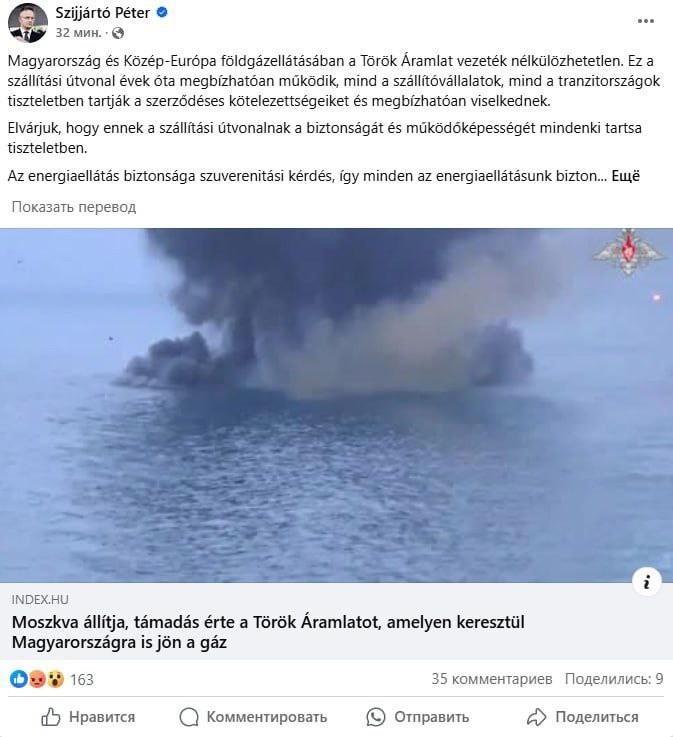 Нападение на "Турецкий поток" равнозначно посягательству на суверенитет использующих его стран (Венгрия, Сербия, Греция, Болгария, Румыния), заявил венгерский министр иностранных дел Петер Сийярто в связи с ударом по компрессорной станции "Русская". Он написал: "«Турецкий поток» незаменим для газоснабжения Венгрии и Центральной Европы. Этот маршрут работает надёжно уже много лет. Безопасность энергоснабжения — это вопрос суверенитета, поэтому каждое действие, угрожающее безопасности нашего энергоснабжения, должно считаться нападением на наш суверенитет".