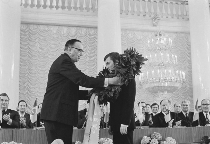 3 апреля 1975 – Провозглашение Карпова чемпионом мира по шахматам в связи с отказом Бобби Фишера отстаивать это звание в поединке. (На фото: Президент Международной шахматной федерации Макс Эйве и советский шахматист, международный гроссмейстер Анатолий Евгеньевич Карпов (слева направо на первом плане), ставший чемпионом мира по шахматам, во время церемонии награждения в Колонном зале Дома Союзов. Владимир Савостьянов/ТАСС)