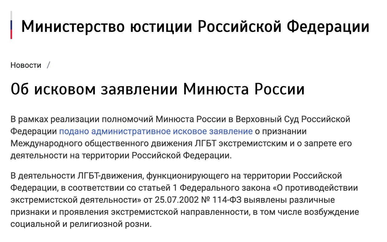 "В рамках реализации полномочий Минюста России в Верховный Суд Российской Федерации подано административное исковое заявление о признании Международного общественного движения ЛГБТ экстремистским и о запрете его деятельности на территории Российской Федерации. В деятельности ЛГБТ-движения, функционирующего на территории Российской Федерации, в соответствии со статьей 1 Федерального закона «О противодействии экстремистской деятельности» от 25.07.2002 № 114-ФЗ выявлены различные признаки и проявления экстремистской направленности, в том числе возбуждение социальной и религиозной розни", - сообщила пресс-служба Минюста.
