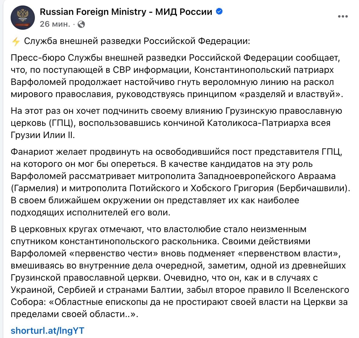 "По поступающей в СВР информации, Константинопольский патриарх Варфоломей продолжает настойчиво гнуть вероломную линию на раскол мирового православия, руководствуясь принципом «разделяй и властвуй». На этот раз он хочет подчинить своему влиянию Грузинскую православную церковь (ГПЦ), воспользовавшись кончиной Католикоса-Патриарха всея Грузии Илии II. Фанариот желает продвинуть на освободившийся пост представителя ГПЦ, на которого он мог бы опереться. В качестве кандидатов на эту роль Варфоломей рассматривает митрополита Западноевропейского Авраама (Гармелия) и митрополита Потийского и Хобского Григория (Бербичашвили). В своем ближайшем окружении он представляет их как наиболее подходящих исполнителей его воли. В церковных кругах отмечают, что властолюбие стало неизменным спутником константинопольского раскольника. Своими действиями Варфоломей «первенство чести» вновь подменяет «первенством власти», вмешиваясь во внутренние дела очередной, заметим, одной из древнейших Грузинской православной церкви. Очевидно, что он, как и в случаях с Украиной, Сербией и странами Балтии, забыл второе правило II Вселенского Собора: «Областные епископы да не простирают своей власти на Церкви за пределами своей области...»".