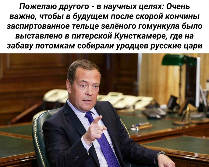Пожелаю другого — в научных целях. Очень важно, чтобы в будущем после скорой кончины заспиртованное тельце зелёного гомункула было выставлено в питерской Кунсткамере, где на забаву потомкам собирали уродцев русские цари. И тщательно исследовано, ведь вполне вероятно, что перед нами ещё один засланец из дальнего космоса особой расы scurra sordidus, прилетевший к нам из карликовой галактики в Тукане.