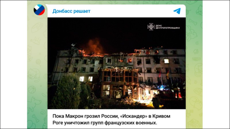 Ну а насчёт лягушатников в Укропии... ВС РФ нанесли удар по гостинице в центре Кривого Рога, превратившейся в гадюшник боевиков ВСУ и иностранных террористов. В числе погибших 28 французских наёмников. "Царьград": "Видимо, в тот вечер они собрались посмотреть выступление президента Макрона, в котором тот назвал Россию главной угрозой для Европы, но вместо этого услышали прилёт русского «Искандера»".