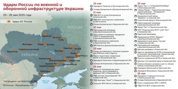 🔹 25 мая нанесён массированный удар высокоточным оружием большой дальности и ударными БпЛА по предприятиям военно-промышленного комплекса Украины, выпускающим для вооружённых сил Украины компоненты ракетного оружия, радиоэлектронику, взрывчатые вещества, ракетное топливо и ударные беспилотные летательные аппараты («Житомирский ремонтный завод радиотехнического оборудования «Луч», «СПЕЦОБОРОНМАШ» — Житомирская область; «Завод Рапид», «Черниговский завод радиоприборов», «Научно-производственная компания «Техавиаком» — Черниговская область; «Конотопский авиаремонтный завод «Авиакон» — Сумская область; «Красиловский агрегатный завод» — Хмельницкая область; «Павлоградский химический завод» — Днепропетровская область; Завод «Луч» научно-исследовательского центра «Проминь» — Тернопольская область; предприятие радиоэлектронной промышленности «НПП «Аэротехника-МТЛ», КБ «Луч» — Киевская область; Одесский авиационный завод; предприятие разработки и производства БпЛА «Девиро» — Днепропетровская область; авиационно-ремонтный завод «Чугуев» — Харьковская область). Также поражены центры радио и радиотехнической разведки в Киевской области, цеха по производству БпЛА, взрывчатых веществ и боеприпасов для ударных БпЛА в Сумской, Николаевской, Черниговской, Харьковской и Киевской областях; места производства и пункты управления БпЛА на полевом аэродроме Гоголев в Киевской области. Кроме того, поражены центры радиотехнической разведки и спутниковой связи в Киевской области, стоянка боевых катеров и цех по сборке безэкипажных катеров в Николаевской области, объекты инфраструктуры аэродрома Школьный в Одесской области и полевого аэродрома Вишневое в Харьковской области.