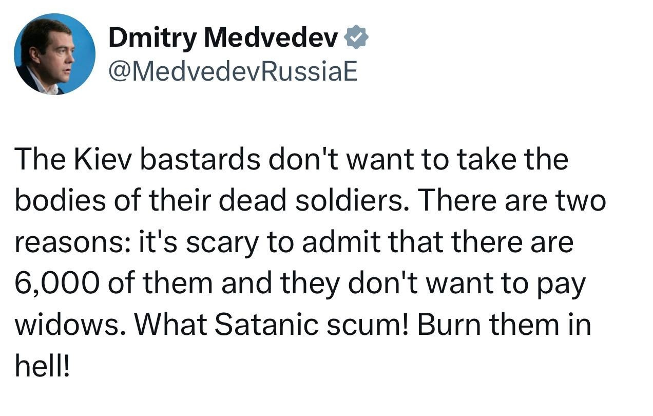 "Киевские ублюдки не хотят забирать тела своих погибших солдат. Причин две: страшно признать, что их 6000, и не хотят платить вдовам. Какая сатанинская мразь! Гореть им в аду!", - резюмировал заместитель председателя Совета Безопасности РФ Дмитрий Медведев в соцсети X.