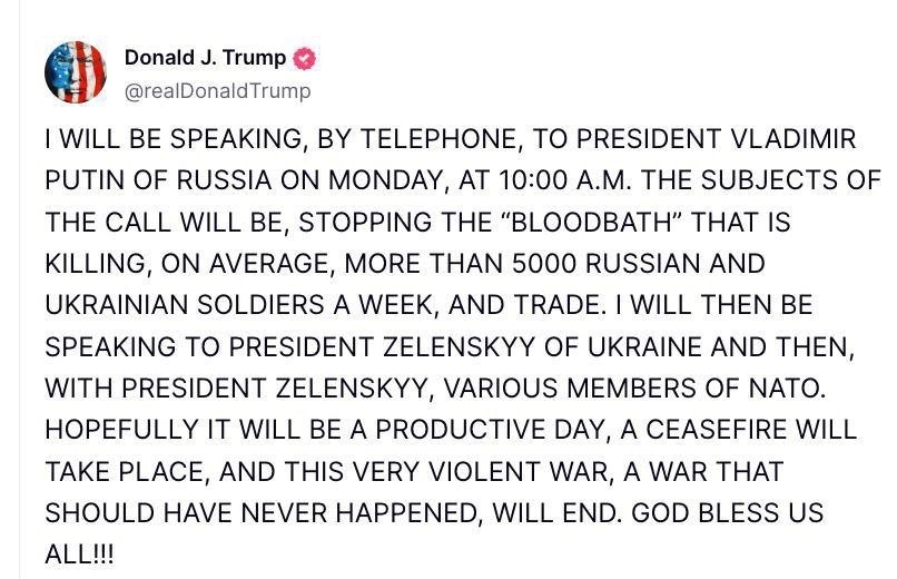 Президент США написал в соцсети Truth Social, что 19 мая в 10:00 (17:00 мск) у него будет разговор с Владимиром Путиным: "Я поговорю по телефону с президентом России Владимиром Путиным в понедельник в 10:00 утра. Темы разговора — прекращение «кровавой бани», которая уносит в среднем более 5000 жизней российских и украинских солдат каждую неделю, а также вопросы торговли. Затем я проведу разговор с президентом Украины Зеленским, а после этого — с ним и с различными представителями НАТО. Надеюсь, день будет продуктивным, удастся достичь прекращения огня, и эта крайне жестокая война, которая никогда не должна была начаться, наконец завершится. Да благословит нас всех Бог!!!"