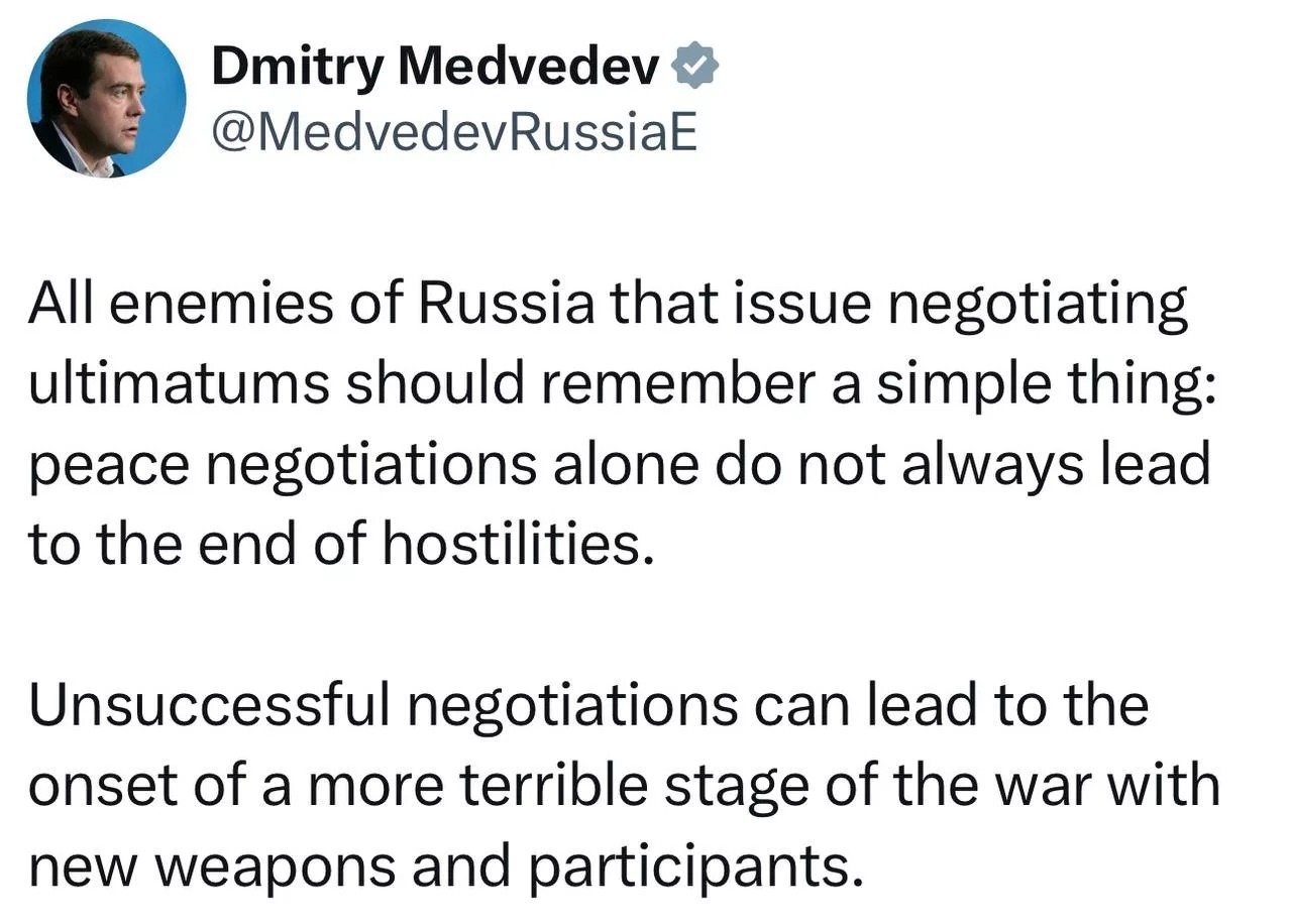 Заместитель председателя Совета Безопасности России, первый заместитель председателя Военно-промышленной комиссии РФ Дмитрий Медведев предупредил страны Запада. "Всем врагам России, выдвигающим переговорные ультиматумы, следует помнить простую вещь: мирные переговоры сами по себе не всегда приводят к прекращению военных действий. Неудачные переговоры могут привести к началу более страшной стадии войны — с новым оружием и новыми участниками".