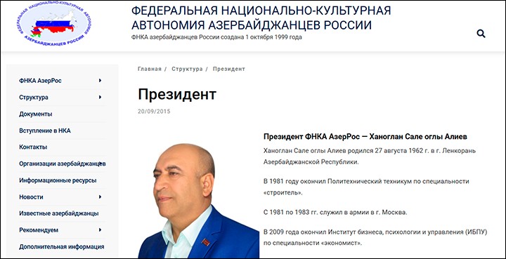 Степень влияния: высокая. Его организация — ведущая в России, он взаимодействует с основными "лидерами общественного мнения" из числа уроженцев Азербайджана, что позволяет решать как финансовые, так и общественно-политические вопросы.