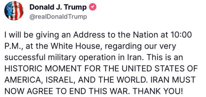Вскоре опять про "нашу очень успешную военную операцию в Иране". Со следующей фразой: "Это ИСТОРИЧЕСКИЙ МОМЕНТ ДЛЯ СОЕДИНЁННЫХ ШТАТОВ АМЕРИКИ, ИЗРАИЛЯ И ВСЕГО МИРА. ИРАН ДОЛЖЕН ТЕПЕРЬ СОГЛАСИТЬСЯ ЗАВЕРШИТЬ ЭТУ ВОЙНУ". Ну да - войну, которую на глазах у всех начали сионисты.