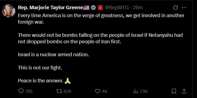 Многие именитые конгрессмены-республиканцы, однопартийцы Трампа, моментально приветствовали его действия. "Военная операция в Иране должна послужить чётким напоминанием нашим противникам и союзникам о том, что у президента Трампа дела не расходятся со словами. Президент дал лидеру Ирана все возможности для заключения сделки, но Иран не согласился на договорённости о ядерном разоружении. Решительные действия президента не позволяют крупнейшему в мире государству-спонсору терроризма, которое скандирует «Смерть Америке», заполучить самое смертоносное оружие на планете. Президент Трамп последовательно и ясно заявлял, что не потерпит наличия у Ирана ядерного оружия", - написал спикер Палаты представителей Конгресса США Майк Джонсон (евангелист-сионист, избирательные кампании которого традиционно спонсирует крупная еврейская лоббистская группировка "Американо-израильский комитет по общественным связям", AIPAC) в соцсети Х. Аплодирует препаскуднейший сенатор-содомит Линдси Грэм, внесённый в российский список террористов-экстремистов. Однако среди известных республиканцев есть и люди с другими взглядами. Член Палаты представителей от штата Кентукки, основатель компании SensAble Technologies и давний недруг AIPAC Томас Мэсси: "Это неконституционно". Член Палаты представителей от штата Джорджия, видная трампистка (теперь уже бывшая?), христианская националистка (по собственному определению) и активистка движения MAGA Марджори Тейлор Грин: "Каждый раз, когда Америка находится на пороге величия, мы ввязываемся в очередную иностранную войну. На людей в Израиле не падали бы бомбы, если бы Нетаньяху сначала не сбросил бомбы на людей в Иране. Израиль — это государство, обладающее ядерным оружием. Это не наша война. Мир — вот ответ".