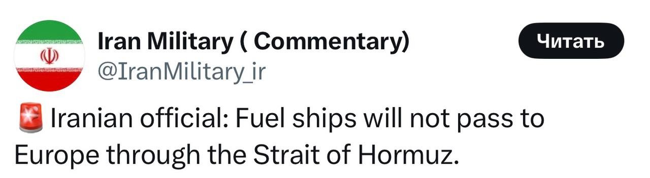 Старший советник председателя парламента Ирана Мехди Мохаммади: "Масштабы ущерба Фордо и другим ядерным объектам — это совершенно второстепенный вопрос. Важно то, что рука агрессора Америки должна и будет отсечена. Чтобы отсечь руку Америки, нужно перерезать горло Нетаньяху". Иранский телеведущий показал в эфире карту штатовских военных баз и подчеркнул: "Они однозначно легитимные цели Ирана. С учётом того, какие шаги США предприняли в отношении Ирана. Они нарушили воздушное пространство Ирана и совершили преступление в отношении Ирана, утратив своё место в Западно-Азиатском регионе. Мистер американский президент, вы это начали — мы это закончим!" Главный редактор иранской газеты Kayhan Хоссейн Шариатмадари полагает, что Тегерану нужно долбануть ракетами по кораблям ВМС США и закрыть Ормузский пролив - ключевой маршрут транспортировки нефти. Депутат иранского парламента Ахмад Хоссейн Фалахи: "Иран, безусловно, реализует многоуровневые ответные меры, включая выход из ДНЯО и блокирование Ормузского пролива, что станет чётким сигналом для агрессора". Министр иностранных дел ИРИ Аббас Арагчи (отправился в Москву для встречи с Владимиром Путиным) констатировал, что Тегеран на данном этапе рассматривает все варианты реагирования, не исключая и перекрытие Ормузского пролива: "Они нарушили суверенитет моей страны, и мы ответим". Представитель КСИР бригадный генерал Алиреза Тангсири: "Ормузский пролив будет полностью закрыт, если агрессия против нашего суверенитета продолжится". Депутат Эсмаил Косари: "Парламент пришёл к выводу, что Ормузский пролив необходимо закрыть, однако окончательное решение по этому вопросу принимает Высший совет национальной безопасности". Аккаунт Министерства обороны Ирана: "Нефтяные танкеры не пройдут в Европу через Ормузский пролив" (в проливе творится хаос - более 50 нефтяных танкеров пытаются срочно покинуть его, опасаясь, что Иран перекроет выход немедленно).