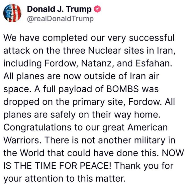 "Мы завершили нашу очень успешную атаку на три ядерных объекта в Иране, включая Фордо, Натанз и Исфахан. Все самолёты сейчас находятся за пределами воздушного пространства Ирана. Полный боезапас БОМБ был сброшен на основной объект, Фордо. Все самолёты благополучно возвращаются домой. Поздравляю наших великих Американских Воинов. В мире нет другой армии, которая смогла бы это сделать. СЕЙЧАС ВРЕМЯ ДЛЯ МИРА! Спасибо за ваше внимание к этому вопросу", - написал Трамп в своей соцсети Truth Social.