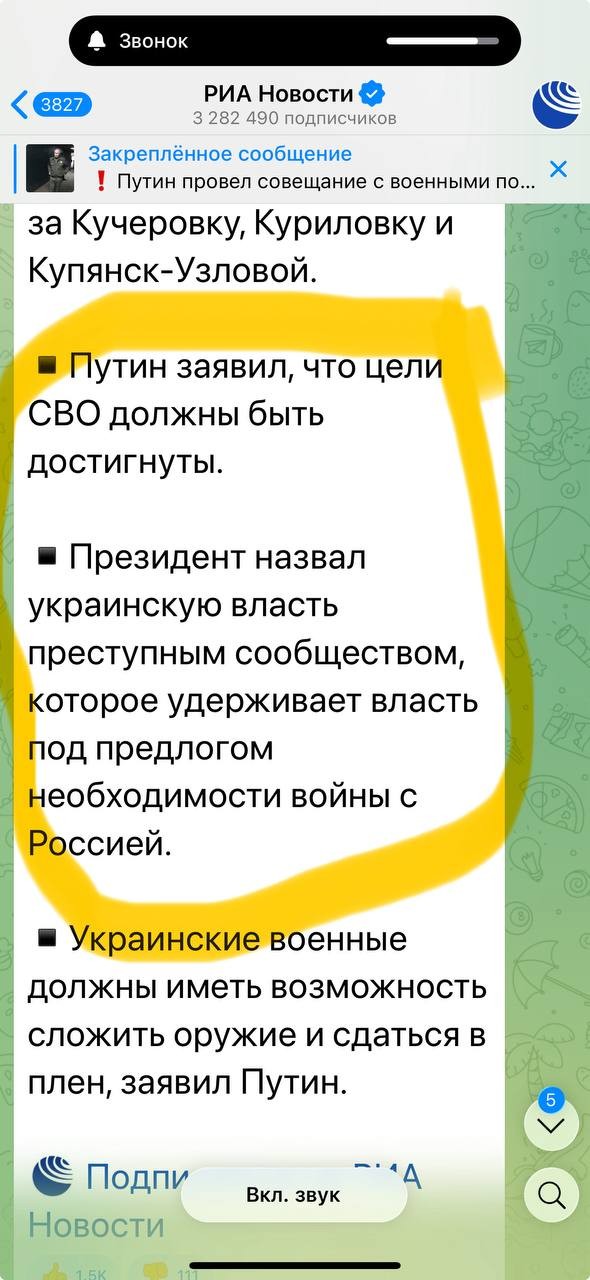 Член Совета при Президенте РФ по развитию гражданского общества и правам человека, военкор Александр Коц: "На фоне очередного информационного ажиотажа вокруг внезапно возникшего американского мирного плана по Украине Владимир Путин нагрянул на командный пункт группировки войск «Запад», чтобы заслушать о положении дел на фронте. Начальник Генштаба посетовал, что украинское политическое руководство не даёт своим безнадёжно окружённым военнослужащим возможности сдаться в плен. На что Верховный Главнокомандующий ответил предельно жёстко и понятно. И это был ответ сразу всем западным СМИ, которые сегодня в полемическом угаре разбирали по деталям очередной пис дил (мирная сделка — англ.). «Это уже никакое не политическое руководство. С марта прошлого года — это преступная группировка, организованное преступное сообщество, которое узурпировало власть и под предлогом необходимости продолжения войны с Россией удерживает эту власть с целью личного обогащения, — констатировал Верховный Главнокомандующий. — И это стало хорошо известным теперь фактом по результатам антикоррупционного расследования в самой Украине. И думаю, что для всех понятно, что эти люди, сидя на золотых горшках, вряд ли думают о судьбе своей страны, о судьбе простых людей Украины, офицерского состава, а тем более простых солдат, им не до этого. Но у нас с вами свои задачи, безусловное достижение целей специальной военной операции и решение задач, которые ставят перед нами наше Отечество и народ России. Народ России надеется на вас, надеется на вас и ожидает нужного стране результата». Собственно, с утра уже бессмысленно звонить Дмитрию Пескову или Марии Захаровой с вопросами об очередной «дорожной карте», составленной где-то за океаном. Российский президент чётко дал понять, что никакой «заморозки» по линии фронта не будет. Мы вам предлагали свой вариант. Мы вас предупреждали, что следующий будет хуже. Не хотите? Тогда мы продолжаем СВО. Присутствовавшие на совещании генералы подтвердили позицию президента бронебойными фактами. Купянск — наш, идёт зачистка разрозненных групп. Ямполь — наш. 80 процентов Волчанска и 75 процентов Покровска освобождены. 4 000 зданий зачищены в Константиновке. Не надо нам ничего предлагать в аренду. За своим мы идём сами".