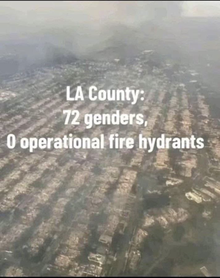 Ранее мэр Лос-Анджелеса Карен Рут Басс признала ситуацию "опасной" и предложила пострадавшим от пожаров обратиться за помощью на несуществующий сайт "URL". Та самая афродемократка-прогрессистка Басс, первая женщина на посту мэра в истории города, которая в конце 2024 года сократила бюджет пожарного департамента на $17,6 млн (в том числе на $13 млн - статьи на МТО и обслуживание систем водоснабжения пожарных линий), а менее чем за неделю до начала возгораний в агломерации распорядилась сократить бюджет пожарной службы ещё на $49 млн, что привело к закрытию 16 пожарных станций. Эти деньги были потрачены на "полуночное кафе для трансгендеров*" (целью финансирования является "поддержка безопасного убежища для беззащитных трансгендерных* лиц в Голливуде"), "программы месяца наследия лесбиянок, геев, бисексуалов и трансгендеров*", "хор геев* Лос-Анджелеса", "международный архив геев и лесбиянок*", программу "Научная фантастика, магия квиров: сексуальная наука и Imagi-Nation" (посвящена ЛГБТК*-оккультизму), награды Национальной ассоциации содействия прогрессу цветного населения (NAACP), "месяц истории афроамериканцев", "месяц наследия латиноамериканцев" и "месяц истории азиатских американцев".