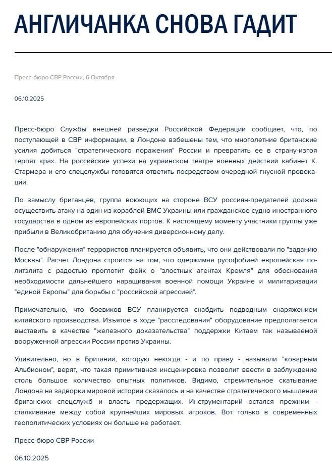 "По поступающей в СВР информации, в Лондоне взбешены тем, что многолетние британские усилия добиться «стратегического поражения» России и превратить её в страну-изгоя терпят крах. На российские успехи на украинском театре военных действий кабинет К. Стармера и его спецслужбы готовятся ответить посредством очередной гнусной провокации.