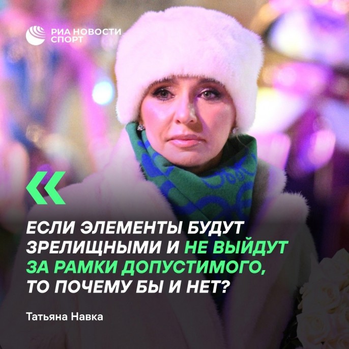 К одиозной депутатше присоединилась супруга пресс-секретаря Президента РФ. "Ключевым моментом является представление номеров: если акробатические элементы будут зрелищными и интересными и не выйдут за рамки допустимого, то почему бы и нет?", - заявила РИА Новости светская львица, бизнесвумен, олимпийская чемпионка-2006 в танцах на льду Татьяна Навка.