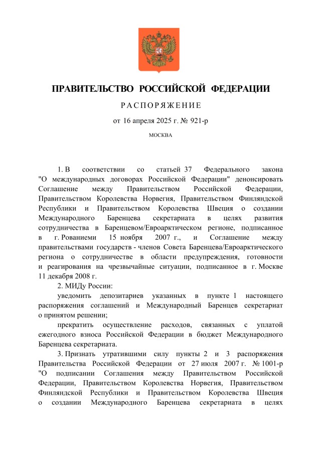 Правительство Российской Федерации денонсировало соглашение с Норвегией, Финляндией и Швецией о создании Международного Баренцева секретариата в целях развития сотрудничества в Баренцевом/Евроарктическом регионе от 15.11.2007. И соглашение со странами–участницами Совета Баренцева/Евроарктического региона о сотрудничестве в области предупреждения, готовности и реагирования на чрезвычайные ситуации от 11.12.2008.