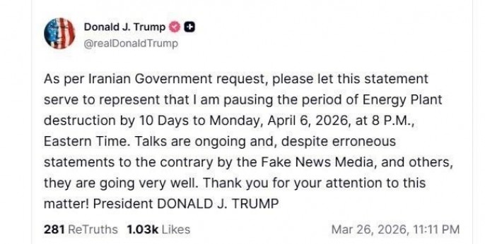 Соответствующую публикацию он разместил в своей соцсети Truth Social: "Согласно просьбе Иранского Правительства, прошу считать это заявление подтверждением того, что я приостанавливаю период разрушения Электростанций на 10 Дней, до понедельника, 6 апреля 2026 года, 20:00 по Восточному Времени. Переговоры идут, и, несмотря на ошибочные заявления Лживых СМИ и других, они идут очень хорошо. Спасибо за ваше внимание к этому вопросу! Президент ДОНАЛЬД ДЖ. ТРАМП".