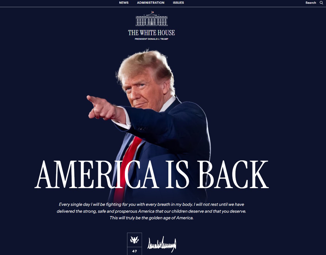 Сайт Белого дома поменял дизайн главной страницы - теперь на ней размещена фотография Трампа с надписью: "Америка вернулась".
