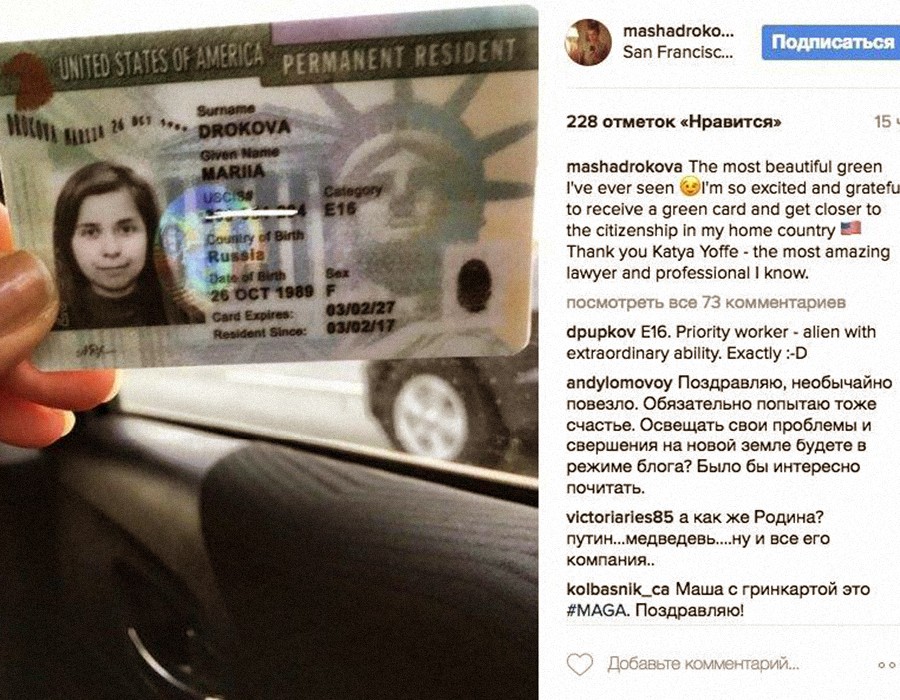 В 2017-м получила грин-карту категории E16 ("иностранец с выдающимися способностями"), о чём с восторгом сообщила в своём аккаунте в Instagram*. "Самый красивый зелёный [цвет], который я когда-либо видела. Я так рада и благодарна получить грин-карту и стать ближе к гражданству в моей родной стране США. Спасибо Кате Иоффе — самый удивительный и профессиональный юрист, которого я знаю", - написала бывшая "патриотка"; к фото с грин-картой проставлен геотег международного аэропорта Сан-Франциско. В январе 2018-го она создала в Кремниевой долине собственный венчурный фонд Day One Ventures (который инвестировал в такие компании, как Superhuman, FutureFamily, DigitalGenius, Domuso, Atoms, CatalogDNA и Nebia), профинансированный тем же эмигрантом-миллиардером Белоусовым. В 2019-м включена в список Forbes 30 Under 30 в категории "Венчурный капитал", ненадолго навестила Россию и выступила на Петербургском международном экономическом форуме (сессия "Время молодых. Новые лица мирового бизнеса"), где заявила: "Сегодня — эпоха возрождения, а творцы — предприниматели. Чтобы создать что-то новое, ты действуешь на пересечении креативности и драйва. Главное — превратить видимость в действие и не отказываться от идей, которые приходят в голову". В кулуарах ПМЭФ-2019 дала интервью журналу Forbes: "Я уехала из России более шести лет назад. Первая работа, которой я занималась, — глава по коммуникациям Acronis. Это компания, которая занимается защитой данных. В Acronis я занималась пиаром более чем в тридцати странах. Там я очень много узнала про пиар и про международные коммуникации. После этого я уехала в Нью-Йорк, где основала пиар-студию. Изначально у студии была очень маленькая команда, потому что было сложно сразу найти много успешных специалистов. Несмотря на большое количество проектов — почти 3000 за три года, которые к нам обращались, мы выбрали всего 25. Из этих 25 компаний четыре стали «единорогами»: WeWork, Houzz, HotelTonight, Gett. Это был очень крутой результат. Ещё восемь компаний выросли в стоимости свыше $100 млн. Это навело на мысль, что мы можем находить правильные команды. Плюс был предыдущий опыт работы в фонде Runa Capital. Я подумала, что я хочу быть ангельским инвестором, который инвестирует в компании и помогает им с пиаром — так чтобы это были более долгосрочные отношения с компаниями, которые мне нравятся. И как ангельский инвестор я уже сделала инвестиции больше чем в десять компаний. Через полтора года сделала первый выход из стартапа в области искусственного интеллекта и многократно приумножила свои инвестиции. <...> Мы создали фонд Day One Ventures, который инвестирует в стартапы и рассказывает их истории, то есть мы не просто инвестируем, но ещё и покрываем потребность проектов в коммуникациях и пиаре. Есть определённый способ, технология, как мы это делаем. <...> Среди наших партнёров основатели и топ-менеджеры технологических компаний, представители банковской индустрии из Barclays. JP Morgan, Goldman Sachs и др. Большое количество людей поверили в нашу стратегию и стали инвесторами в фонд. Мы инвестируем в проекты на ранних стадиях, которые называются pre-seed, seed и series A. И называемся Day One Ventures не случайно: есть известная концепция основателя и гендиректора Amazon Джеффа Безоса о day one компаниях — компаниях, которые живут каждый день, как будто это самый первый день, когда компания началась. <...> У day one компаний есть важный критерий, который называется obsessio