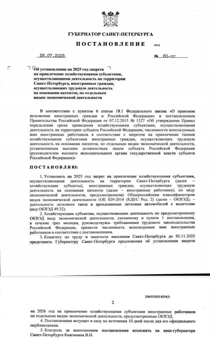 Об этом рассказала пресс-служба Смольного 28 июля. "Губернатором Санкт‑Петербурга в соответствии с пунктом 6 статьи 18.1 Федерального закона «О правовом положении иностранных граждан в Российской Федерации» принято решение об установлении запрета на привлечение хозяйствующими субъектами иностранных граждан, осуществляющих трудовую деятельность на основании патентов, по виду экономической деятельности «деятельность легкового такси и арендованных легковых автомобилей с водителем» (код ОКВЭД 49.32) на период до конца 2025 года. Решение направлено на повышение качества и безопасности услуг в сфере такси и создание дополнительных возможностей для трудоустройства граждан Российской Федерации. Для хозяйствующих субъектов предусмотрен трёхмесячный переходный период, в течение которого они смогут завершить действующие трудовые отношения и привлечь новых работников для осуществления своей деятельности по указанному ОКВЭД. Введение запрета на указанный временной период (до конца 2025 года) позволит на практике оценить его социально-экономическое влияние на жизнь города и принять взвешенное решение о необходимости применения подобных мер в 2026 году. Постановление вступит в силу по истечении 10 дней", - говорится в сообщении.