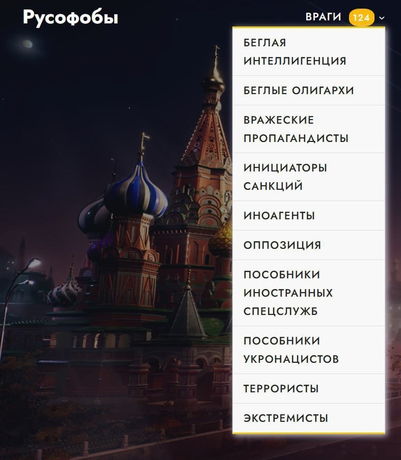 Сейчас в разделе "Враги" размещены сведения о 124 лицах (рубрика делится на подгруппы, такие как "Беглая интеллигенция", "Беглые олигархи", "Вражеские пропагандисты", "Инициаторы санкций", "Иноагенты", "Оппозиция", "Пособники иностранных спецслужб", "Пособники укронацистов", "Террористы" и "Экстремисты"), в разделе "Вражеские организации" – данные о 67 организациях; надо понимать, что это только начало, чёрный список будет обновляться/расширяться еженедельно.