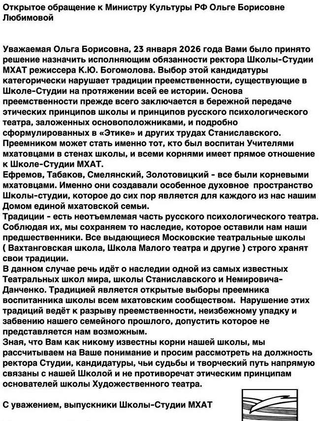 "Уважаемая Ольга Борисовна, 23 января 2026 года Вами было принято решение назначить исполняющим обязанности ректора Школы-Студии МХАТ режиссёра К.Ю. Богомолова. Выбор этой кандидатуры категорически нарушает традиции преемственности, существующие в Школе-Студии на протяжении всей её истории. Основа преемственности прежде всего заключается в бережной передаче этических принципов школы и принципов русского психологического театра, заложенных основоположниками, и подробно сформулированных в «Этике» и других трудах Станиславского. Преемником может стать именно тот, кто был воспитан Учителями мхатовцами в стенах школы, и всеми корнями имеет прямое отношение к Школе-Студии МХАТ. Ефремов, Табаков, Смелянский, Золотовицкий — все были корневыми мхатовцами. Именно они создавали особенное духовное пространство Школы-студии, которое до сих пор является для каждого из нас нашим Домом единой мхатовской семьи. Традиции — есть неотъемлемая часть русского психологического театра. Соблюдая их, мы сохраняем то наследие, которое оставили нам наши предшественники. Все выдающиеся Московские театральные школы (Вахтанговская школа, Школа Малого театра и другие) строго хранят свои традиции. В данном случае речь идёт о наследии одной из самых известных Театральных школ мира, школы Станиславского и Немировича-Данченко. Традицией является открытые выборы преемника — воспитанника школы всем мхатовским сообществом. Нарушение этих традиций ведёт к разрыву преемственности, неизбежному упадку и забвению нашего семейного прошлого, допустить которое не представляется нам возможным. Зная, что Вам как никому известны корни нашей школы, мы рассчитываем на Ваше понимание и просим рассмотреть на должность ректора Студии, кандидатуры, чьи судьбы и творческий путь напрямую связаны с нашей Школой и не противоречат этическим принципам основателей школы Художественного театра", - говорится в обращении.