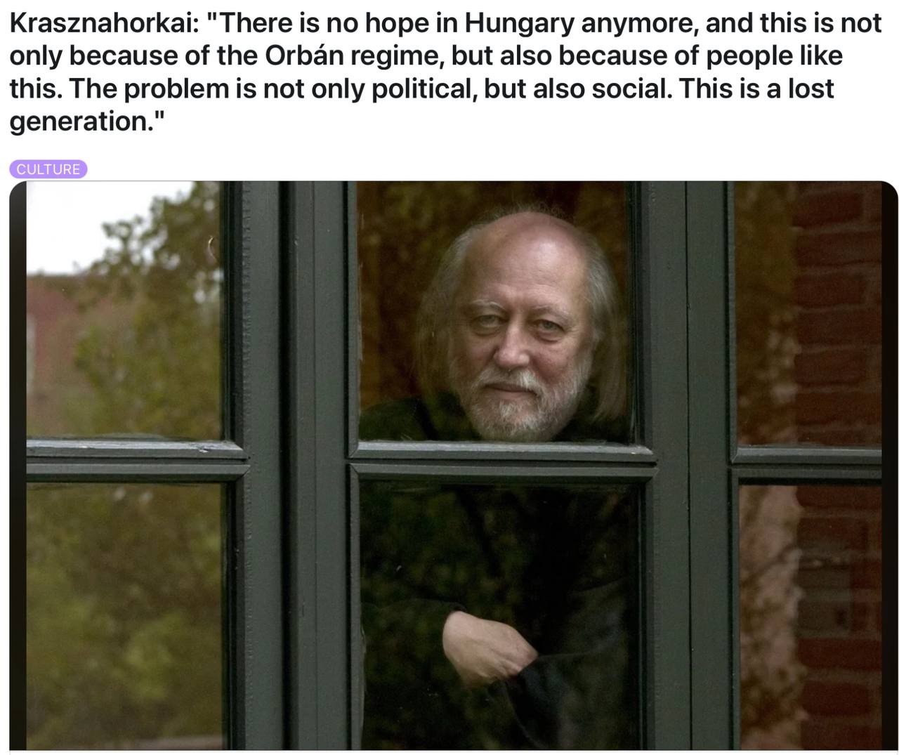 Краснахоркаи тоже вполне подошёл. Перманентный оппозиционер-антигосударственник, ненавидящий власти родной Венгрии и лично Виктора Орбана, обитающий то в Германии (имеет немецкое гражданство), то в Италии. Пламенный заукраинец и оголтелый русофоб, мечтающий "отправить Путина и его сторонников на Марс". Лауреат премии Фонда Сороса*. Вдобавок правильные гены. "У моего отца были еврейские корни. Но он рассказал нам эту тайну только когда мне было лет 11. До этого я понятия не имел. В эпоху социализма об этом было запрещено упоминать (?! - Прим.). Что ж, я наполовину еврей, но, если в Венгрии всё пойдёт так, как, по всей видимости, и дальше, я скоро стану стопроцентным евреем", - рассказал он греческому изданию в 2018 году.