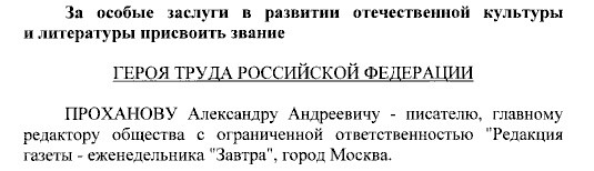 "За особые заслуги в развитии отечественной культуры и литературы присвоить звание Героя труда Российской Федерации Проханову Александру Андреевичу — писателю, главному редактору общества с ограниченной ответственностью «Редакция газеты — еженедельника «Завтра», город Москва", - говорится в документе.