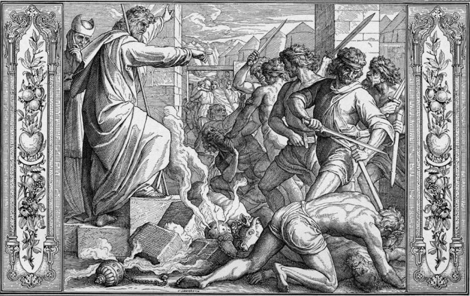 Иллюстрация: Юлиус Шнорр фон Карольсфельд, «Наказание идолопоклонников» (по эпизоду из библейской книги «Исход»: «Моисей увидел, что это народ необузданный, ибо Аарон допустил его до необузданности, к посрамлению пред врагами его. И стал Моисей в воротах стана и сказал: кто Господень, ко мне! И собрались к нему все сыны Левиины. И он сказал им: так говорит Господь Бог Израилев: возложите каждый свой меч на бедро своё, пройдите по стану от ворот до ворот и обратно, и убивайте каждый брата своего, каждый друга своего, каждый ближнего своего. И сделали сыны Левиины по слову Моисея; и пало в тот день из народа около трёх тысяч человек»).