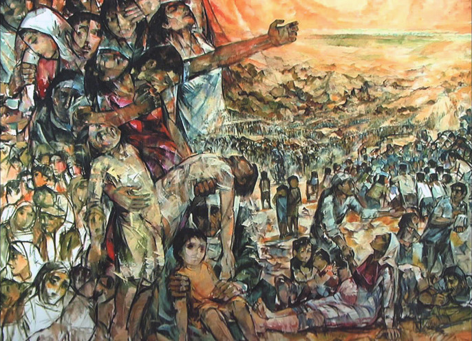 Иллюстрация: фрагмент полотна Исмаила Шаммута. Знаменитый палестинский художник Ismail Shammout в возрасте 18 лет был в числе сотен тысяч палестинцев, которые были вынуждены покинуть свои дома под натиском еврейских сил в целях создания Израиля. Этот драматический опыт нашел отражение во многих его картинах и повлиял на всю его карьеру. Его надежды и мечты вернуться однажды в любимую Палестину привели его в Организацию освобождения Палестины, в качестве директора искусств и национальной культуры. Жил в Египте, Италии, Ливане, Кувейте, Германии, Иордании. В 1953 создал свою первую выставку в городе Газе, и это была первая выставка из когда-либо проводимых палестинскими художниками. В 1969 году избран первым генеральным секретарем союза палестинских художников; в 1971 — первым генеральным секретарем Союза арабских художников. Ismail Shammout умер в возрасте 76 лет 3 июля 2006 года. Его картины считаются одними из самых ценных произведений искусства в арабском мире.