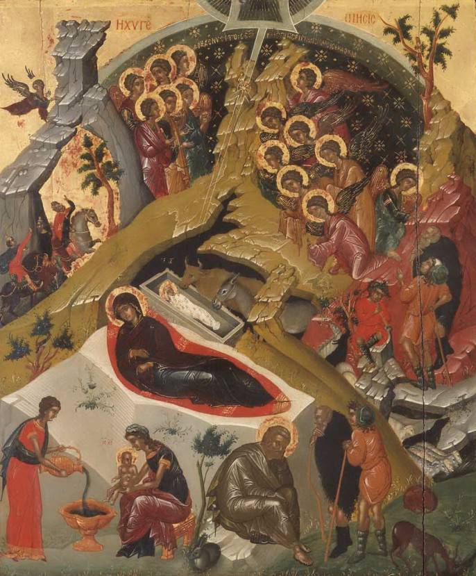 Дева днесь Пресущественнаго раждает, и земля вертеп Неприступному приносит: ангели с пастырьми славословят, волсви же со звездою путешествуют: нас бо ради родися Oтроча младо, Превечный Бог.