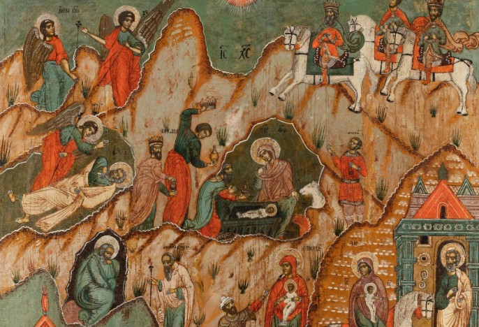 Дева днесь Пресущественнаго раждает, и земля вертеп Неприступному приносит: ангели с пастырьми славословят, волсви же со звездою путешествуют: нас бо ради родися Oтроча младо, Превечный Бог.