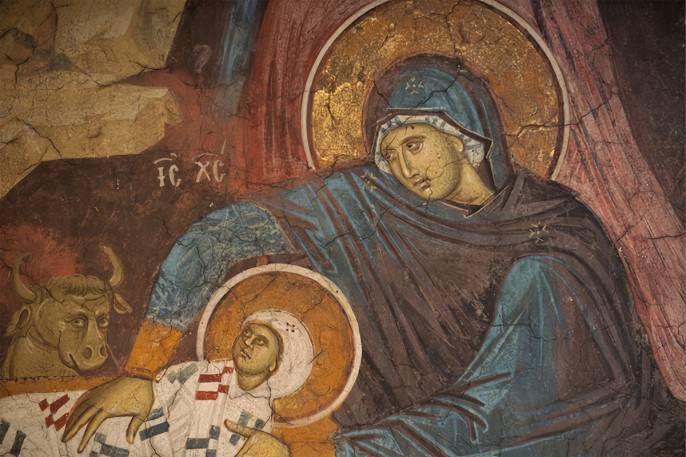 Дева днесь Пресущественнаго раждает, и земля вертеп Неприступному приносит: ангели с пастырьми славословят, волсви же со звездою путешествуют: нас бо ради родися Oтроча младо, Превечный Бог.