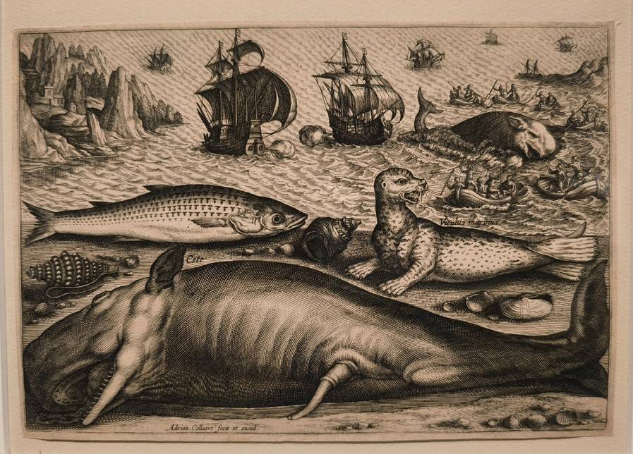 Нашлось место на выставке и морским чудесностям. Огромен и пугающ «Кит, выбросившийся на берег близ Бевервейка» (1602) Яна Санредама. Люди рядом с гигантом – как лилипуты близ Гулливера. Собственно, для голландцев кит не являлся экзотикой - китобойные рейды проводились с конца XVI столетия. Вместе с тем, сильное животное по-прежнему порождало оторопь. Фламандец Адриан Колларт представлен гравюрой «Кит, тюлень и кефаль» (конец XVI – начало XVII вв.). Автор что-то намудрил с размерами - кефаль не так уж велика. Однако это не натурное наблюдение, а своеобразная реклама добывающих промыслов – фоном идёт море, некий город и «шаланды полные кефали». Волшебен каталог раковин (1769) от Джованни Пиранези, выполнявшего заказ для коллекционера и доктора Никколо Гвалтьери.