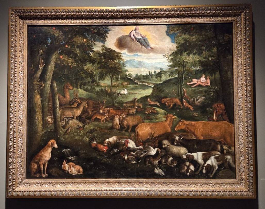 Животный мир изображался на полотнах, рассказывающих об эдемском бытии Адама и Евы – вкруг них мирно пасутся все звери и ладят меж собой. Голландец Ламберт Сустрис показал своё видение Эдема (1570-е гг) – узнаваемые коровы, птицы и лошади пребывают в компании каких-то кото-собак и собако-лисиц. Осёл столь крупен, что выглядит чуть ниже коровы.