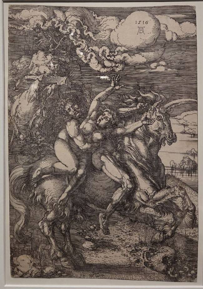 Привлекает внимание работа Альбрехта Дюрера «Похищение на единороге» (1516). В центре композиции — женщина, предположительно Персефона, которую похищает Аид, чтобы доставить её в царство мёртвых. Единорог выступает в качестве союзника Аида. Таким образом, расхожий символ мог использоваться по-разному. Характерно, что единорог и сейчас присутствует в масскульте – в романах стиля фэнтэзи, в виде забавных игрушек, подвесок и украшений. Эти плюшевые и серебряные единорожки лишены смысловых значений и давным-давно не намекают на девственность их обладательницы.